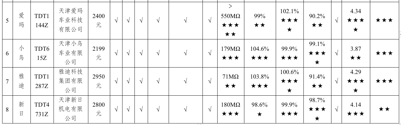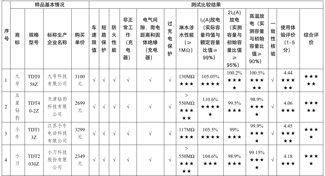 值得注意的是,综合比较试验各方面情况,20款样品中,九号、五星钻豹2个品牌的样品综合表现优秀,获评五星;小牛、小刀2个品牌的样品综合表现良好,获评四星;爱玛、小鸟、雅迪3个品牌的样品综合表现不错,获评三星;品牌为新日的样品获评二星;其他样品存在个别项目不符合国家标准的情况,如本次测试的“绿源”牌TDT2109Z型号、“棒途”牌TDT224Z型号、“台铃”牌TDT5260Z型号、“本铃”牌TDT611Z型号、“鳯凰”牌TDN101Z型号、“鋒鳥”牌TDT402Z型号、“名顶”牌TDT088Z型号、“英格威”牌TDT007Z型号、“尊尚”牌TDT17Z型号、“机仕”牌TDT088Z型号、“永久”牌TDT102Z型号、“飞鸽”牌TDT123Z型号等12个样品,存在个别指标未达到测试标准要求或一致性核验未通过的情形,不予评星。