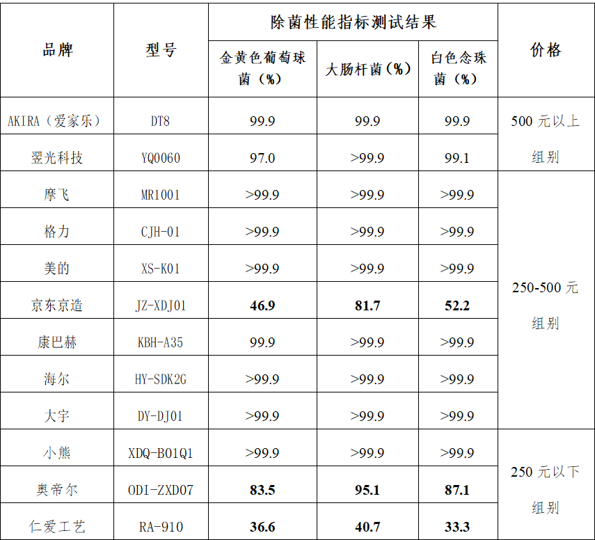 测试结果显示,AKIRA(爱家乐)DT8、摩飞MR1001、格力CJH-01、美的XS-K01、康巴赫KBH-A35、海尔HY-SDK2G、大宇DY-DJ01、小熊XDQ-B01Q1样品对3种微生物的灭杀效果能够达到99.9%或以上,翌光科技YQ0060样品对金黄色葡萄球菌、大肠杆菌和白色念珠菌3种微生物的杀灭效果分别为97.0%、99.9%以上、99.1%。仁爱工艺品牌样品的除菌效果表现最差,3种微生物的除菌率均低于50%。