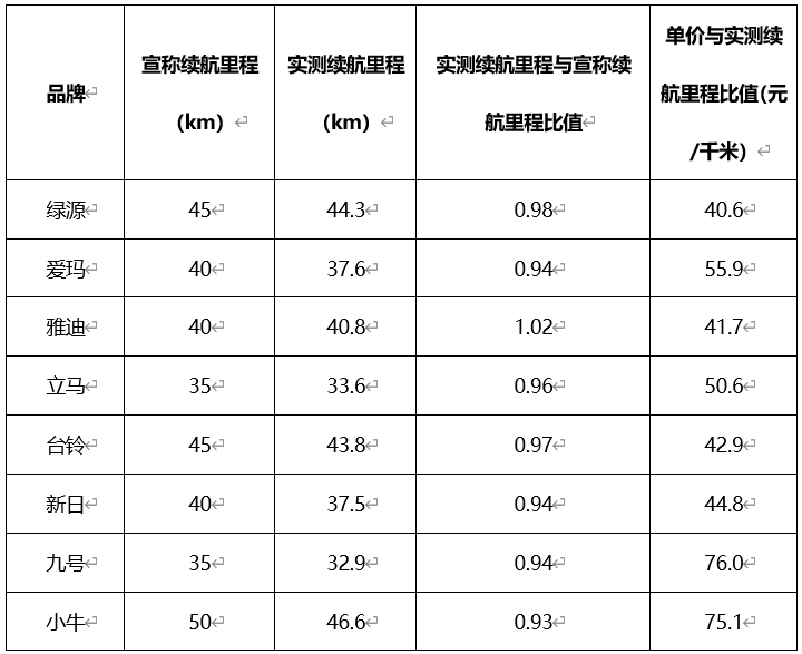 续航能力主要由实测续航里程与宣称续航里程的比值和单价与实测续航里程的比值体现。本次试验模拟了75千克左右的骑行者在有微小起伏的沥青路面骑行,从充满电一直骑行至无法骑行为止。8款样品车中,绿源、雅迪、台铃3款样品车的实测续航里程与宣称续航里程比值、单价与实测续航里程比值较低,意味着性价比较高。