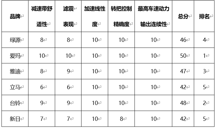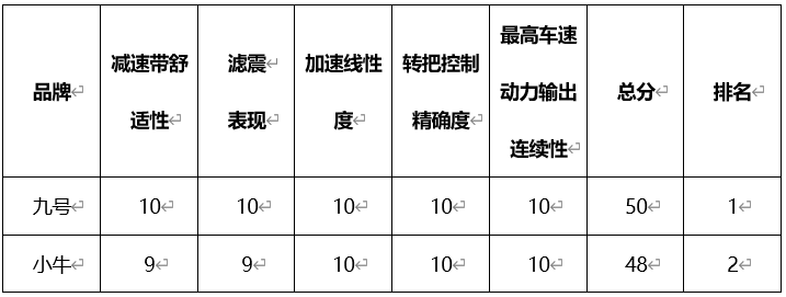 骑乘舒适性,主要从过减速带舒适性、加速平稳性、转把控制精确度(特别是低速控制)、最高车速动力输出连续性等几个方面综合考量。本次购买的绿源、爱玛、雅迪、立马、台铃、新日等6辆车型为简易款,价格相对便宜,功能较为单一,只有开机P档功能。九号、小牛等2辆为非简易款车型,价格相对较高,功能配置较为丰富。由于小牛和九号的售价明显高于其他6款车,因此单独进行评分和排名。