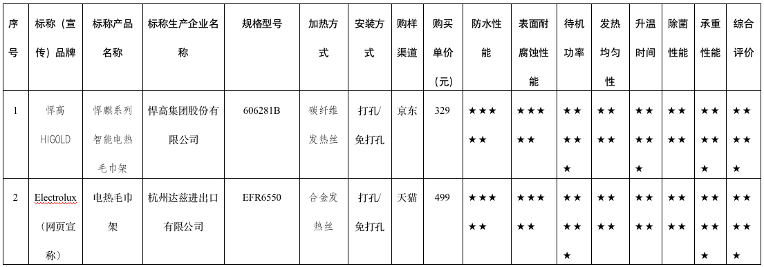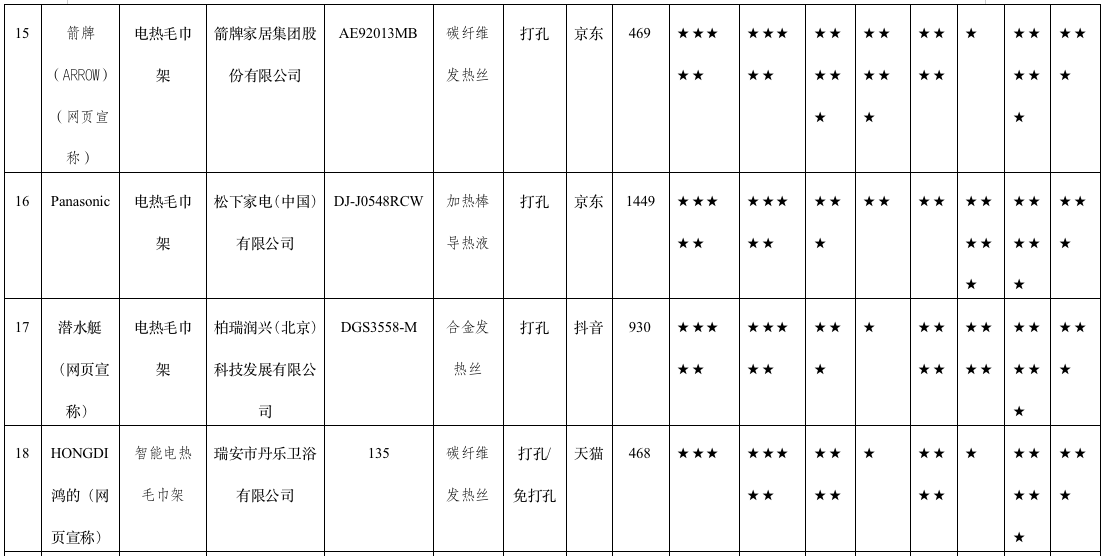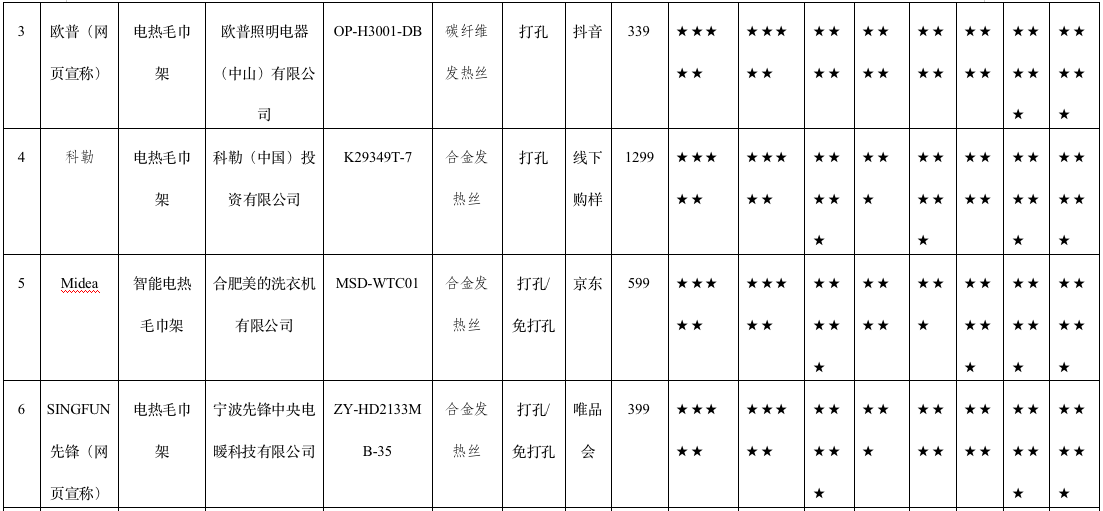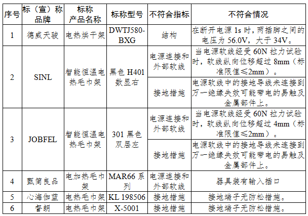 本次比较试验的25款样品中,有19款样品安全性指标均符合测试标准要求,表现良好。有6款样品存在部分指标不符合测试标准要求的情况,主要涉及“结构”“电源连接和外部软线”“接地措施”等。存在安全性指标不符合标准的样品不纳入性能指标比较,这些样品分别是德威天骏电热烘干架、SINL智能恒温电热毛巾架、JOBFEL智能恒温电热毛巾架、甄简良品电加热毛巾架、心海伽蓝电热毛巾架、督朗电热毛巾架。