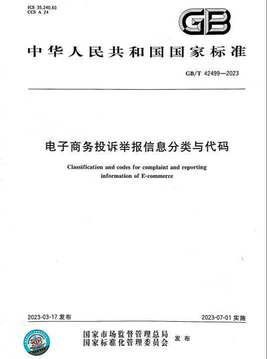 据悉,该标准是市场监管投诉举报领域的首个国家标准,由全国电子商务质量管理标准化技术委员会负责归口,将于2023年7月1日起正式实施,标准编号为GB/T42499—2023。