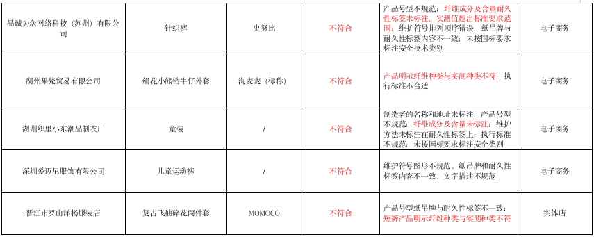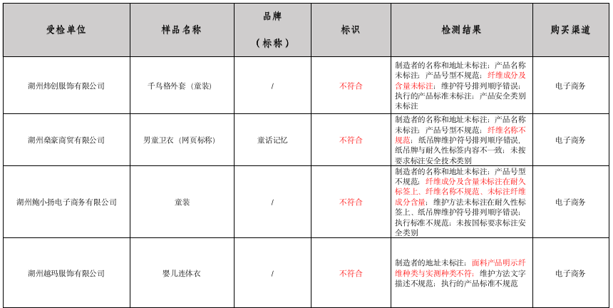 此次比较试验检测的样品中,“童话记忆”“史努比”等9款样品标识不符合标准,其中8款为电商平台随机采购。其中,4款未标注制造者的名称及地址,1款未标注制造者的地址,5款未按国标要求标注安全技术类别。8款在纤维成分及含量方面存在问题:3款未按要求标注纤维成分及含量,1款纤维名称不规范,3款面料产品明示纤维种类与实测种类不符,1款纤维成分及含量实测值超出标准要求范围。