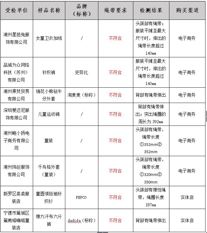儿童及婴幼儿服装绳带要求不符合标准情况表